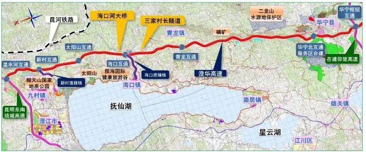 澄华高速位于玉溪市澄江市、华宁县境内,起点位于玉溪澄江市九村镇温水河,止于玉溪市华宁县城西南侧王马村。项目主线长64.31千米,按双向四车道高速公路标准建设,设计速度100千米/小时,设桥梁63座,隧道12座,桥隧比为53.75%。全线共设7处互通式立交、2处服务区、6处收费站。项目建成后对完善和加密区域高速公路网,构建抚仙湖东岸、玉溪市东部南北大通道,更好地适应和推动滇中城市群一体化发展,促进区域旅游资源合理开发和抚仙湖保护,巩固脱贫攻坚成果,推进乡村振兴等方面具有重大意义。