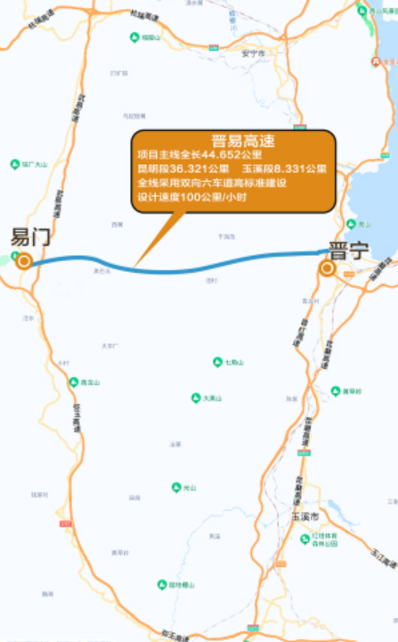 晋易高速项目主线全长44.652公里,其中,昆明段36.321公里,玉溪段8.331公里。全线采用双向六车道高标准建设,路基宽为33.5米,设计速度100公里/小时,项目总投资124.57亿元(昆明段91.04亿元,玉溪段33.53亿元),建设年限2023年—2027年。项目的建设对完善云南省干线公路网、加快滇中产业新区发展、提升滇中经济圈竞争力、加强滇中地区与滇南地区的联动和协调发展具有重要的意义。