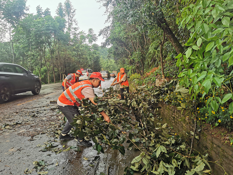 8月14日下午,西畴公路分局青年突击队巡查至国道219线兴街至西畴路段,发现有行道树被大风刮断,倒伏至路面,影响行车安全。青年突击队员们立即采取措施,进行交通管制,用随车携带的油锯、柴刀等工具对行道树进行清理,有效保障了道路安全畅通。