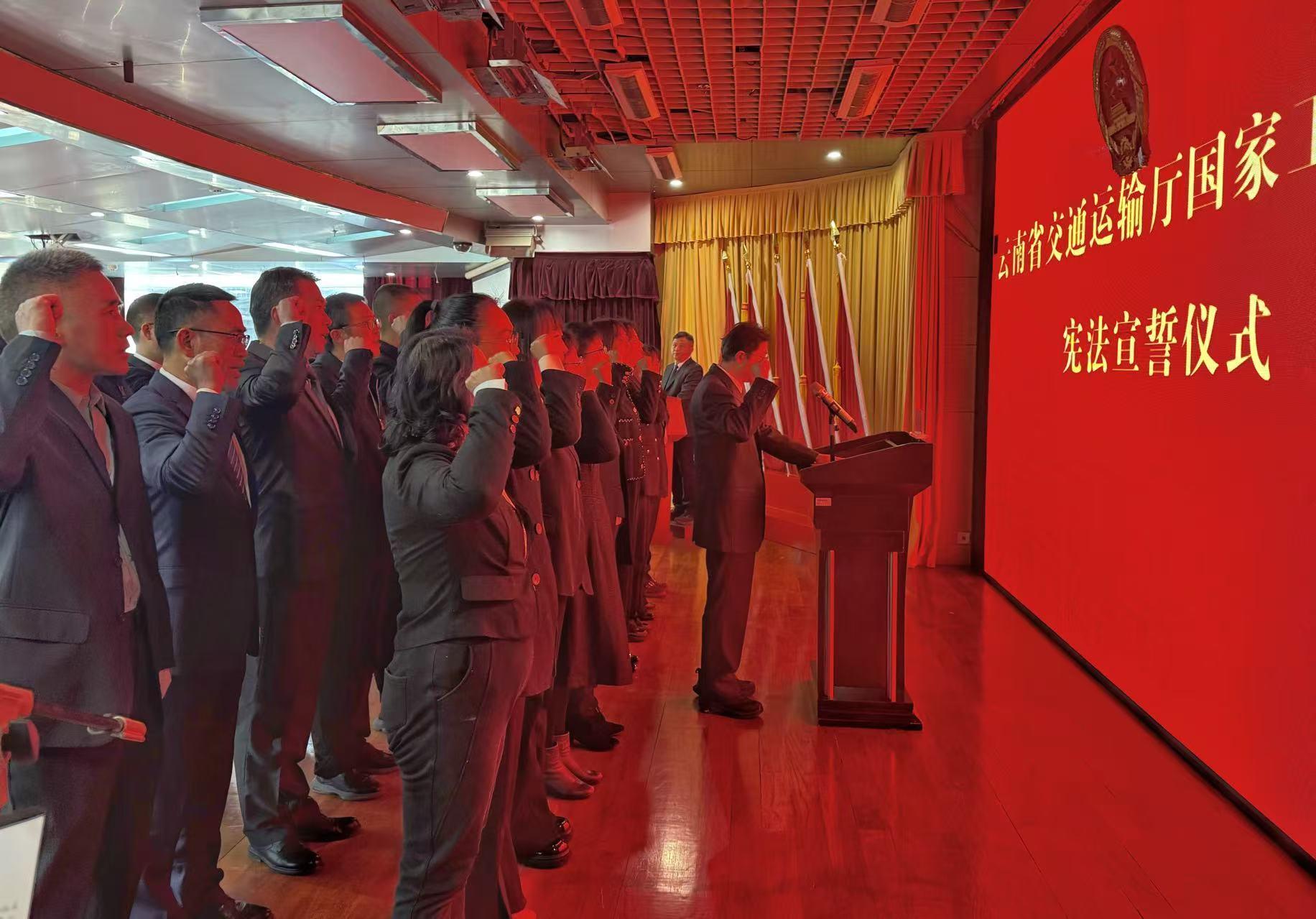 上午9时,省交通运输厅举行宪法宣誓仪式。宣誓台上,厅机关新任命、新入职的46名工作人员整齐列队,神情肃穆。在厅党组成员、副厅长桂昆同志的监誓下,领誓人周明贤同志左手抚按宪法,右手举拳,领诵誓词,其他宣誓人面向国徽,高举右拳,庄严宣誓:“忠于中华人民共和国宪法,维护宪法权威,履行法定职责,忠于祖国、忠于人民,恪尽职守、廉洁奉公,接受人民监督,为建设富强民主文明和谐美丽的社会主义现代化强国努力奋斗!”铮铮誓言响彻现场,既是对宪法权威的尊崇敬畏,也是对忠诚履职的郑重承诺。