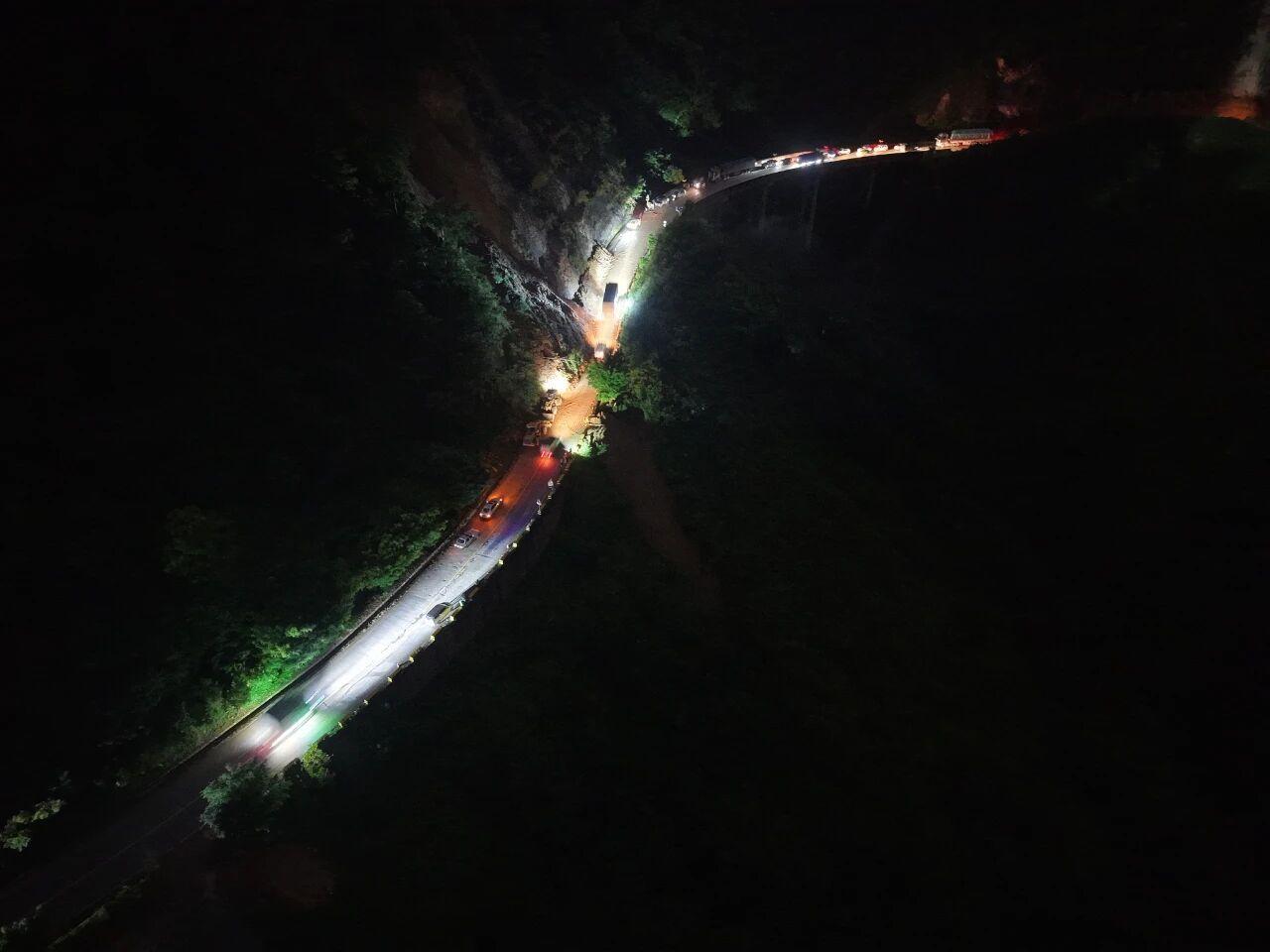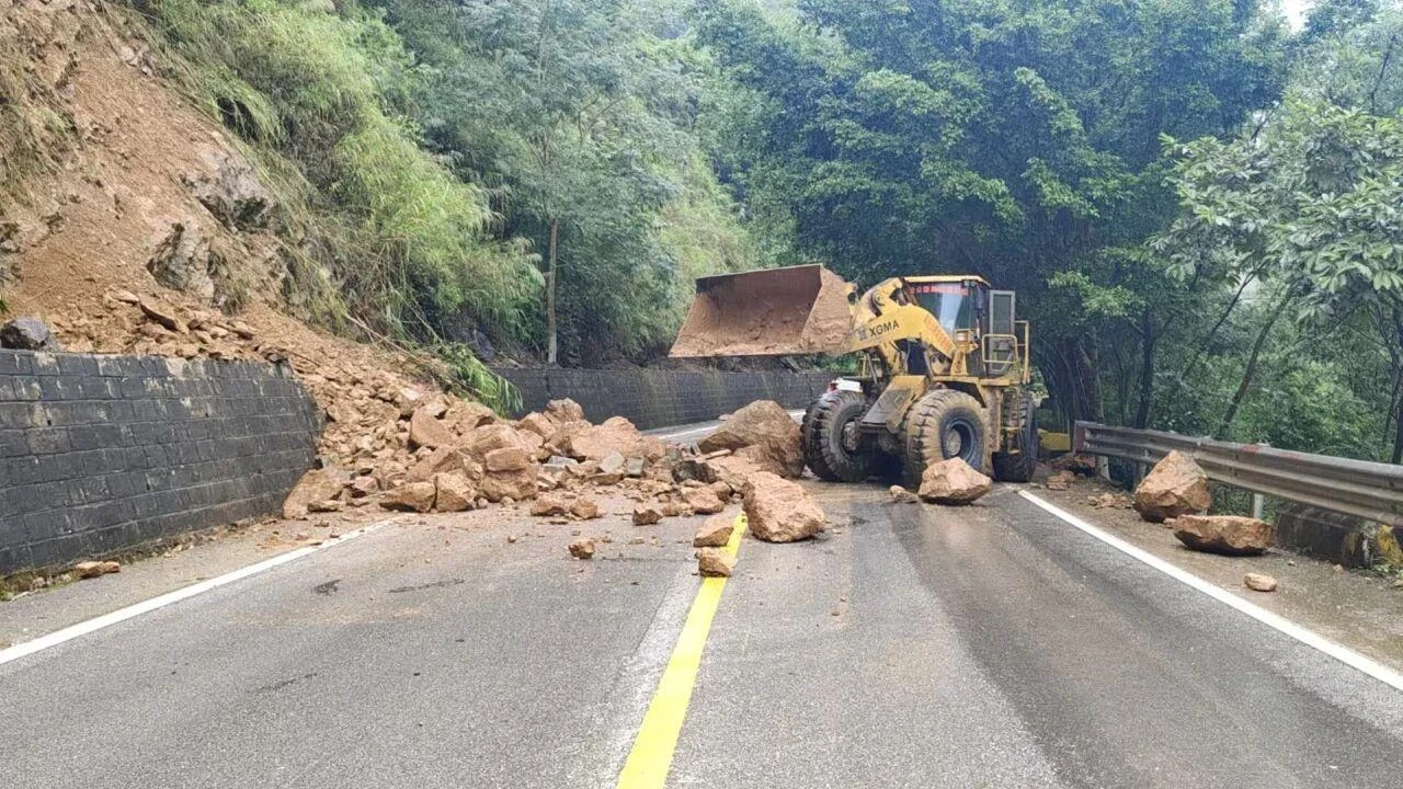 截至目前,调拨机械携带破碎头已抵达现场,研判后进行两头作业,由挖掘机携带破碎头清理巨石,装载机清理泥石流,恢复通行时间待定。