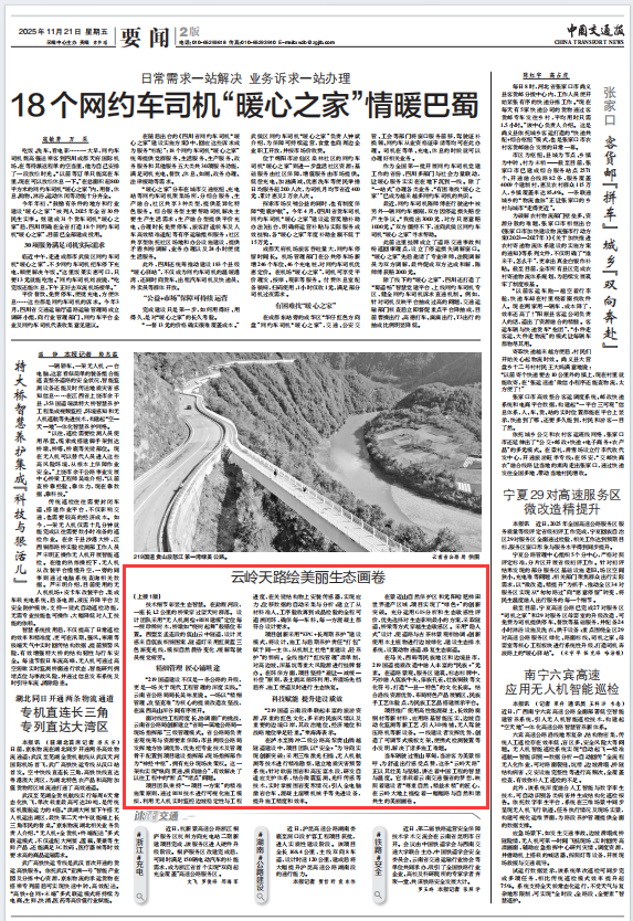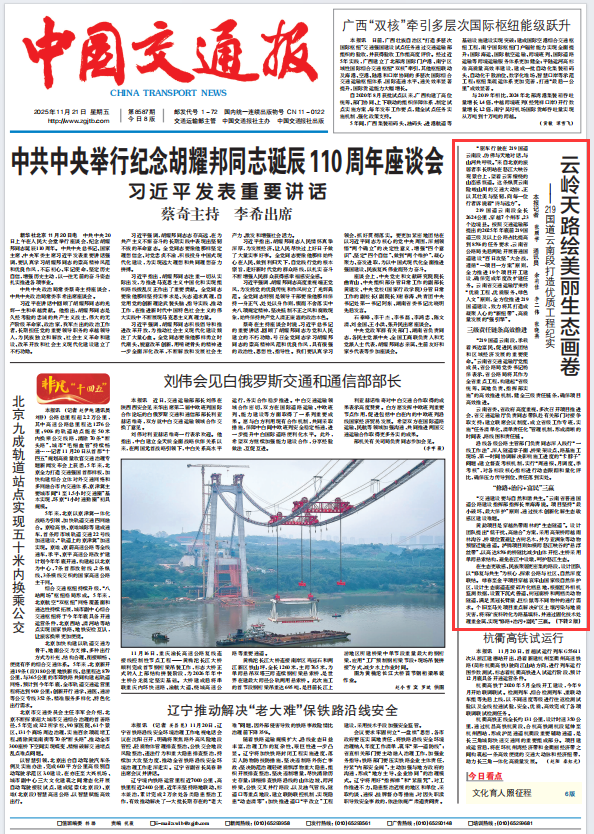 11月21日,中国交通报头版刊登《云岭天路绘美丽生态画卷——219国道云南段打造优质工程纪实》一文,文章以219国道云南段建设为主线,展现了该项目在推进过程中如何统筹工程效率、生态保护与民族特色,打造出一条“优质、绿色、人文”的交通动脉。详细内容如下: