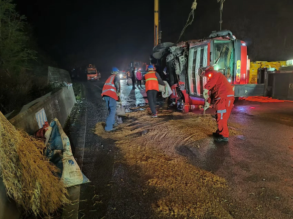 经过3小时的连续奋战,事故现场散落货物全部清理完毕,泄漏油污得到彻底处置,侧翻货车成功拖离现场,中断的道路交通恢复正常通行。