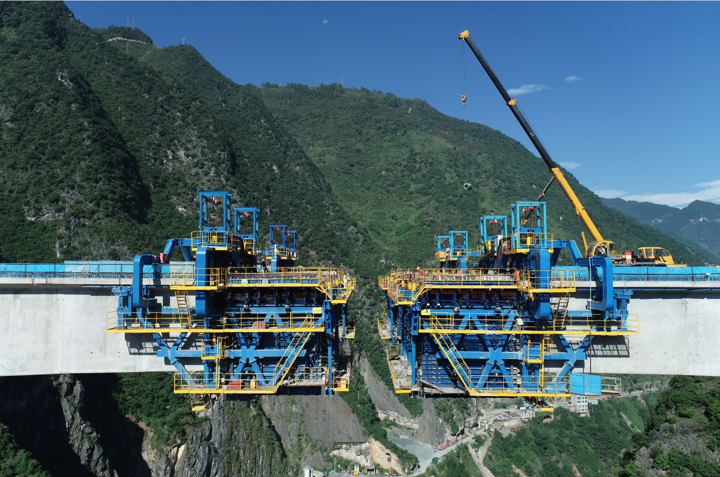 面对山区峡谷复杂环境下高墩、大跨桥梁施工安全风险高的困境,项目建设团队将主梁施工优化为大节段悬浇工艺,最大节段长度调整为6米,悬浇节段数量减少至17节,提前工期2个月。施工采用中铁大桥局研发团队倾力打造的“虹鹰1号”大节段智能悬臂筑桥机,地面拼装后一次整体提升就位,仅用15天完成安装,解决了高墩条件下筑桥机安装风险高、周期长的难题,并且实现了15分钟走行、30分钟调模的高效循环作业,平均9天完成一个节段施工。为贯彻高质量建设理念,筑桥机集成智能喷淋养护系统,实现全时段远程自动化养护,同时配备全方位安全监控系统,对浇筑应力、走行位移、环境数据等进行实时监测,并设置三级响应机制与声光报警装置,全面保障施工安全。