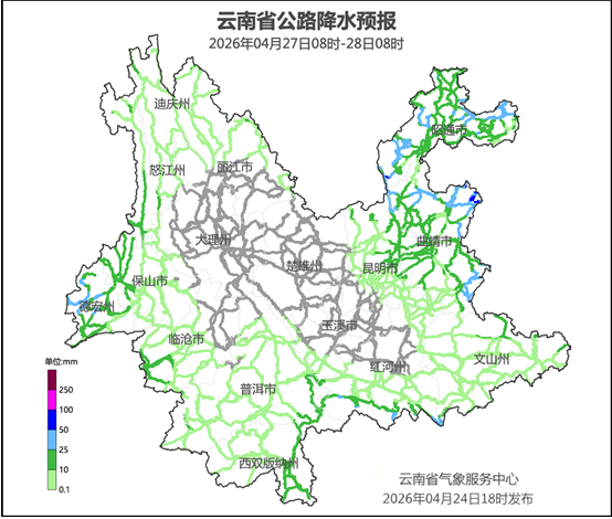 云南省气象台4月24日18时发布重要天气预报:受低涡切变和冷空气共同影响,预计4月27日至29日,我省大部分将出现降温降雨天气过程。中北部最高气温将下降4—6℃,局部地区超过8℃;全省大部分将自东向西出现中雨局部大雨、暴雨,其中,昭通市、曲靖市北部和南部、昆明市南部、楚雄州北部、玉溪市北部和西南部、文山州西南部、红河州南部、普洱市东部、西双版纳州东部、临沧市中西部、保山市、德宏州、怒江州、迪庆州、丽江市北部和东南部过程累计雨量30—60毫米,德宏州西部局部地区80—120毫米。伴随降雨还将出现雷电和局部地区短时强降水、大风、冰雹等强对流天气。请公众注意出行安全和防寒保暖。